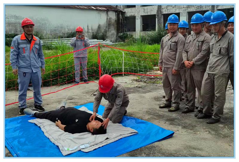 此次演练结合儋州区域施工现场的特点围绕“安全第一、预防为主”的目标开展。本次应急演练分为触电急救、高空坠落、高温中暑急救、火灾消防应急模仿场景进行应急演练。